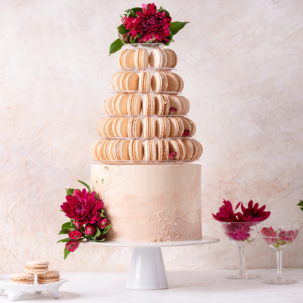 Moderní a praktická varianta vrcholu svatební tabule, se kterou se nemusíte vzdávat tradice rozkrojení svatebního dortu. Originální kombinaci elegantního jednopatrového dortu a křehkých makronek s vanilkovou ganáží zdobí živé květy a luxusní jedlé zlato.